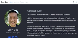 In 2019, I found that .dev has become a top-level domain, as announced by Google. A quick search showed that eson.dev is still available and I purchased the domain in no time. I wanted to use it as an alternative to my LinkedIn profile and give it a more personal touch, to showcase my experience and game projects, and maybe write some articles to share some tips and tricks.